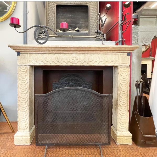 Cornice in pietra di recupero in arenaria gialla realizzata interamente e mano Misure in cm L 126 H 103 P 17, bocca L 89 X H 82, zoccolino 12
