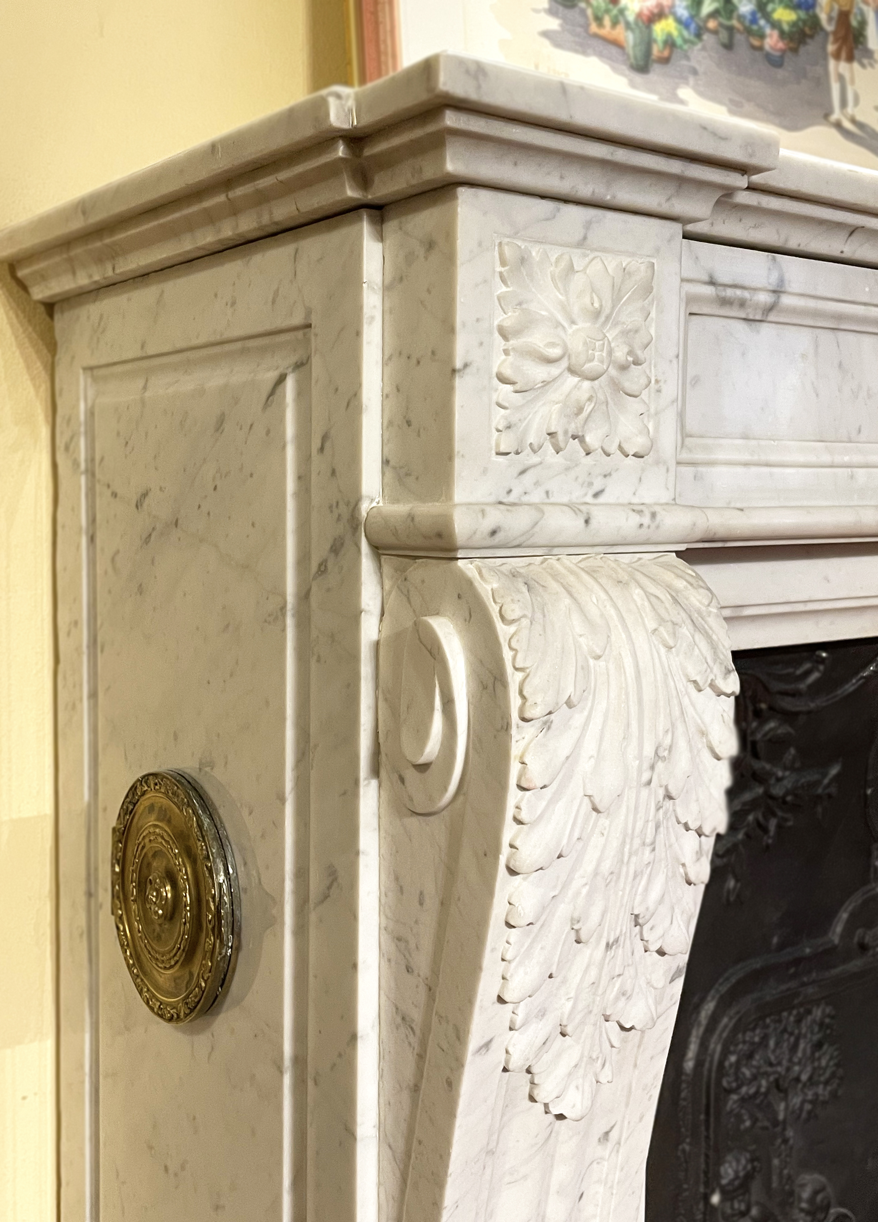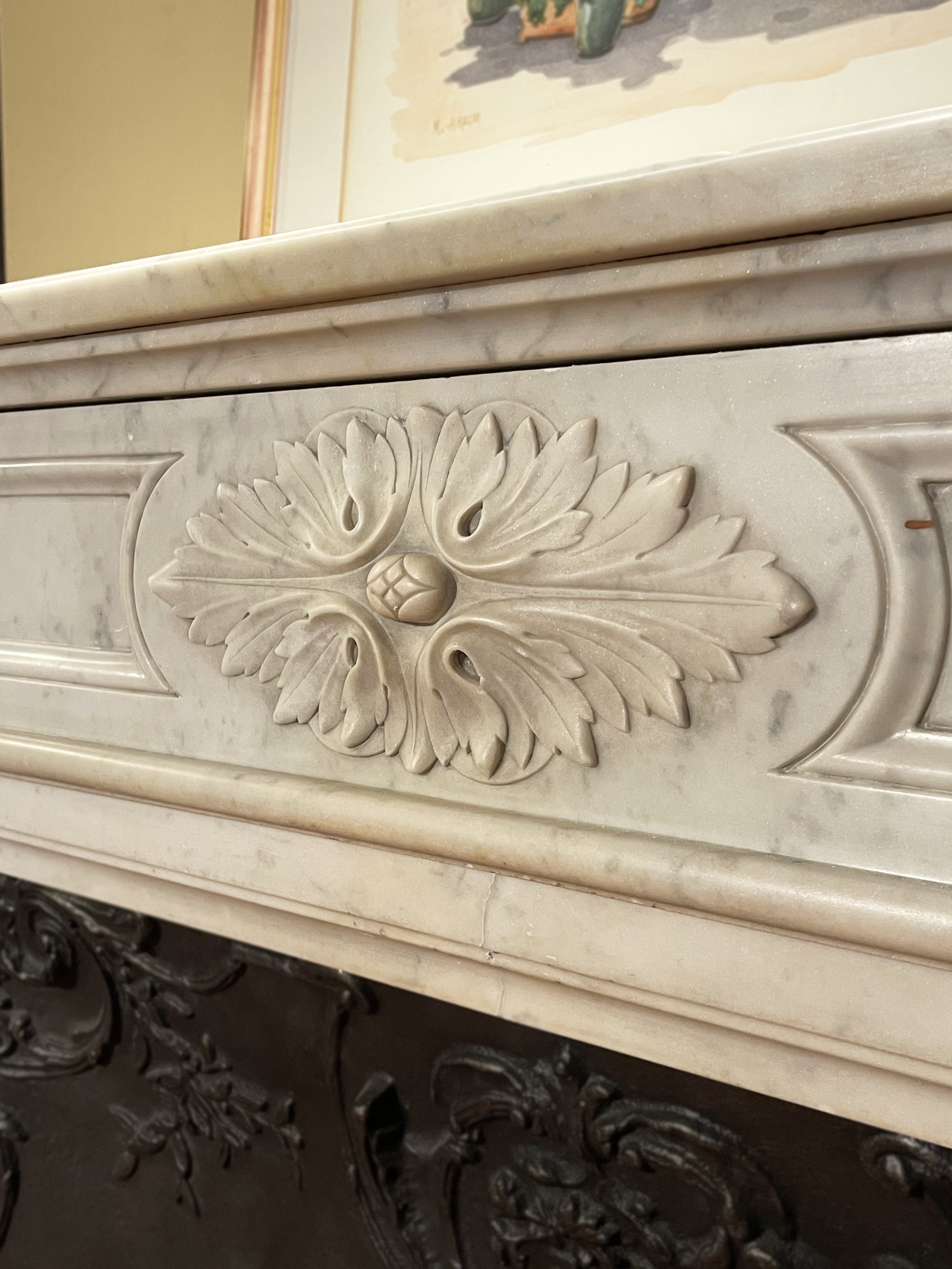 Bellissima cornice in marmo bianco di Carrara, stile Luigi XVI spalle mosse Trois Fleurs con prese d'aria laterali in ottone. Epoca prima metà dell'800 provenienza Parigi. Misure L 125 H 106 P 41 bocca l 82 x h 83