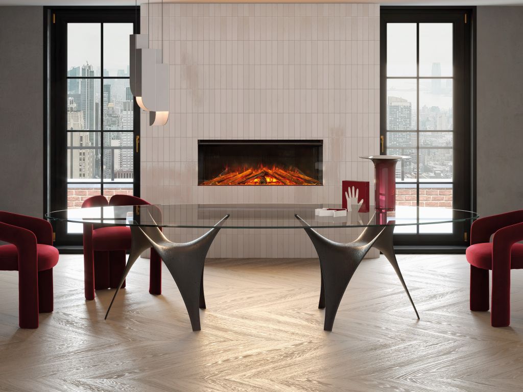 Caminetto elettrico Lumen tecnologia Led, tronchi veri stabilizzati, riscaldamento integrato. Disponibile in tre misure cm 870, 1200, 1600.